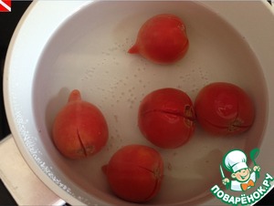 Прежде всего включим духовку на 230 градусов и очистим от кожицы помидоры, нарежем средними кубиками.