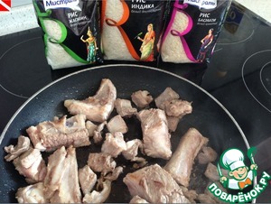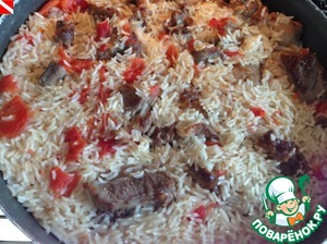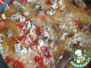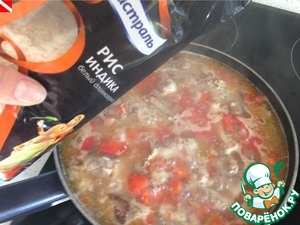 Размешиваем деревянной лопаткой так, чтобы мясо более-менее равномерно распределилось по сковороде. Больше мы блюдо мешать не будем. Теперь следует уменьшить огонь (до 5 при градации в 9 делений) и дать потомиться рису минуты 2.