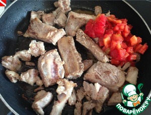 В большой сковороде (испанцы называют ее cazuela) нагреваем оливковое масло, добавляем ребра, нарезанную свинину и мясо с куриной голени. В классическом рецепте этого блюда еще используется колбаска из рубленого свиного мяса (butifarras blancas) - может, Вам удастся ее достать, у нас я не нашла. Обжариваем до золотистого цвета (около 10 минут).