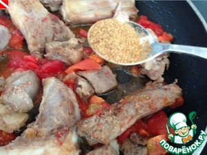 Сладкую паприку (оказывается, в Испании паприка - pimentón, бывает трех видов: pimentón dulce - сладкая, pimentón agridulce - среднеострая и pimentón picante - очень острая). Хорошенько размешиваем