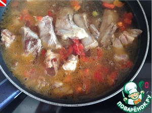 И вливаем горячий бульон. Увеличиваем огонь и даем блюду закипеть.