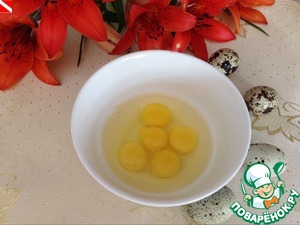 В мисочку разбиваем яйца (к сожалению, куриных у меня не было, поэтому пришлось воспользоваться перепелиными из расчета 3шт. вместо 1 куриного) и размешиваем вилкой. Взбивать не нужно. Вот здесь я тоже немного отступила от рецепта и чуть-чуть подсолила яйца.