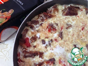 Вот такой рис мы заливаем яйцами и ставим в духовку до образования хрустящей корочки. В Испании это блюдо готовят на открытом огне, на данном этапе, для получения корочки, сковороду накрывают тонкой крышкой, сверху кладут раскаленные угли.