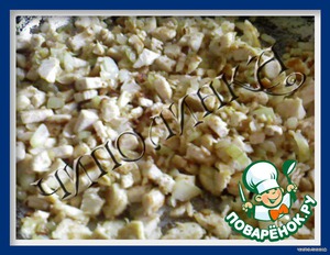 Куриное филе (у меня осталось немного уже вареного, его и использовала) помыть, нарезать мелкими кусочками, лук почистить, мелко нарезать, грибы тоже мелко нарезать.