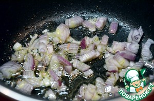 В этой же сковороде пассеруем мелконарезанный репчатый лук до прозрачности.