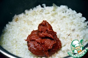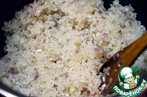 Всыпаем рис и перемешиваем. Обжариваем рис, помешивая, пару минут.