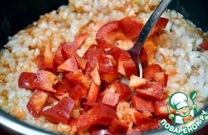 Через 10 минут кладем в сковороду нарезанный кубиками перец.