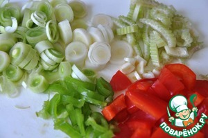 Лук-порей нарезаем кружочками, зелёный перец чили и сельдерей полосками, чеснок и красный болгарский перец кубиками. -