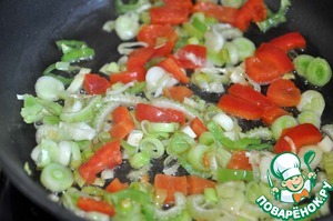 Добавляем чеснок, сельдерей, болгарский перец, обжариваем пару минут.