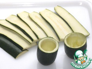 Разрезаем цуккини полосками. Я от каждого цуккини отрезала по стаканчику. Очистила цуккини (стаканчики) внутри от мякоти, и добавила (мякоть) тушить к овощам. А полоски цуккини обжарила с двух сторон.
