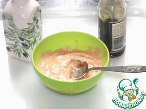 Приготовила соус: взяла сметану, кетчуп, 1 ст. л. оливкового масла, 2 ст. л. соевого соуса, добавила приправу и перемешала.