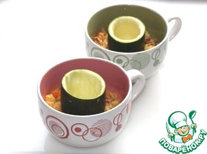 Заполнила стаканчики рисом и поставила в середину чаши, а полоски с рисом расположила по краю. Можно цуккини полить сверху соусом, тогда получится крышечка. Тоже интересный вариант запекания.
