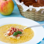 Собрать суп для подачи: в тарелку налить суп, в центр тарелки выложить нарезанные грудку и яблоки, добавить бекон. Можно украсить базиликом. Подавать сразу.