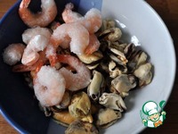 Заранее подготавливаем морепродукты, у меня мидии и варено-мороженные креветки, даём им самопроизвольно оттаять. |