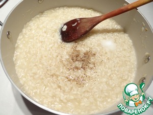 Обжариваю рис, пока он не впитает масло. Добавляю вино, оставляю рис готовиться, пока полностью не впитается вино.
