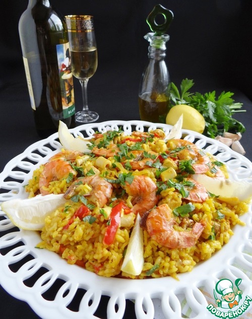 Готовят паэлью в специальной сковороде с широким дном, чтобы рис был распределен на дне максимально тонким слоем для равномерного распределения тепла, а источник тепла должен охватывать дно всей сковороды. К сожалению, такой посуды у меня нет, поэтому готовила я паэлью на плите в толстостенной сковороде. В рецепте шеф-повара использовались мидии, но в моей семье их не едят, поэтому я увеличила количество креветок и кальмаров.