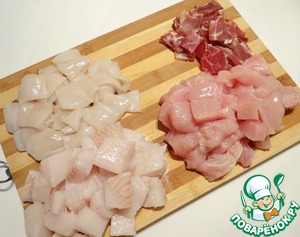 Чищу и мою кальмары, мою филе палтуса, куриное филе. Шейку свиную сырокопченую и кальмары нарезаю на небольшие квадраты, филе палтуса и куриное филе нарезаю кубиками. -