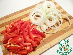 Репчатый лук нарезаю кольцами, а сладкий перец на небольшие полоски. -