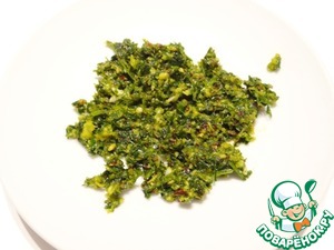 В чашу блендера нарезаю зелень петрушки (немного петрушки оставляю для украшения готового блюда), добавляю очищенный чеснок, шафран, соль. Измельчаю все ингредиенты с помощью блендера.