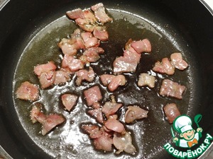 На другой сковороде на оливковом масле немного обжариваю сначала шейку свиную сырокопченую, перекладываю ее на большое блюдо.