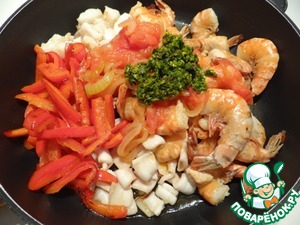 В большой толстостенной сковороде соединяю все обжаренные ингредиенты - кальмары, куриное филе, филе палтуса, шейку свиную, креветки, сладкий перец, лук и помидоры, а также чесночно-шафрановую смесь. Солю и перчу по вкусу (надо учитывать, что мы немного солили куриное филе, а чесночно-шафрановая смесь тоже содержит соль).