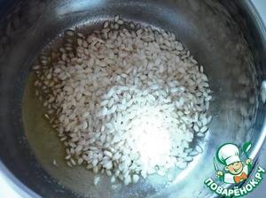 В кастрюле разогрейте 5 г сливочного масла и оливковое масло, выложите рис и хорошо перемешайте.