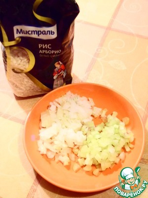 Для ризотто я использовала рис Мистраль Арборио. Лук и сельдерей мелко порежьте.