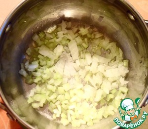 В кастрюле (или сковороде) разогрейте 1 ст. л. оливкового и 5 г сливочного масла, положите лук и сельдерей и потушите на небольшом огне около 10-15 минут, чтобы овощи размягчились.