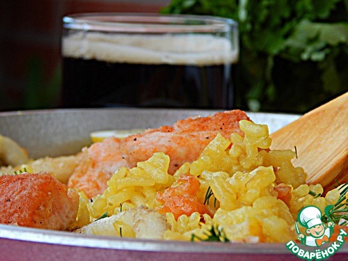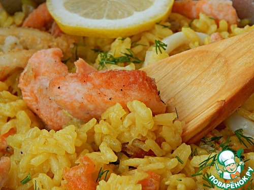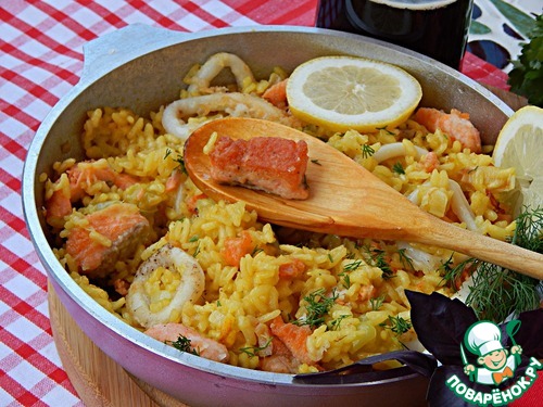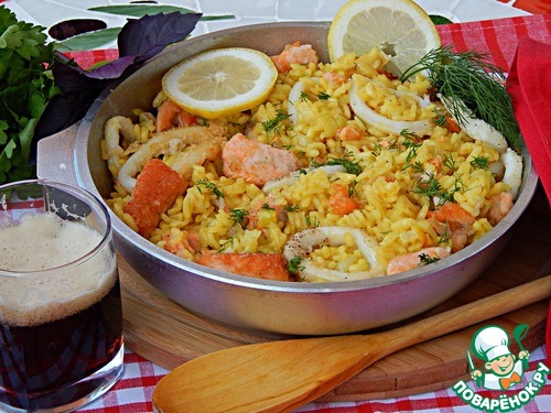 Рецепт «Паэлья на пиве с лососем и кальмарами»: