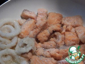 Кальмары нарезаем кольцами, филе лосося - небольшими кусочками. Все обваливаем в смеси муки и черного перца, выкладываем на отдельную сковороду с разогретым оливковым маслом (2ст. л.) и обжариваем до готовности.