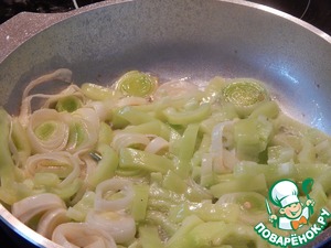 Оставшееся оливковое масло выливаем на раскаленную сковороду, добавляем порезанный лук-порей и сладкий перец, солим и обжариваем в течении 5 минут.