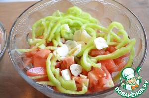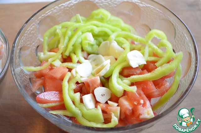 Первым делом нужно подготовить помидоры и овощи. Помидоры обдать кипятком, снять кожу и порезать небольшими кубиками, поместить в мисочку и слегка присолить, порезать сладкий зеленый перец и отправить к помидорам. Почистить и порезать чеснок кружочками, отпавить в миску к помидорам и перцу.