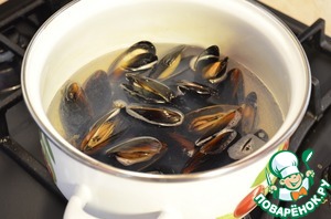 В этой же воде отварить мидии (предварительно промываем, каждую ракушку чистим щеткой), когда ракушки раскроются, значит мидии готовы.