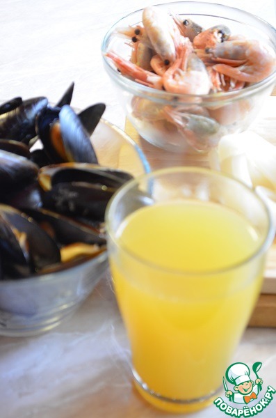 Бульон после варки морепродуктов процедить. Мне понадобился полный стакан бульона, в котором я развела шафран.
