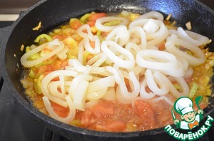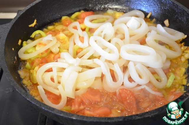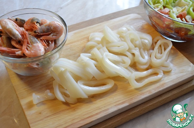 Кальмары порезать кольцами, у меня были уже очищенные кальмары. Если у Вас они в кожице, не беда, обдайте их кипятком, уберите внутренности.