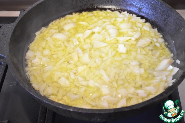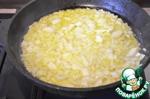Репчатый лук порезать кубиками. Разогреть оликовое масло в сковороде с толстым дном и стенками. Лук обжарить до прозрачного состояния.