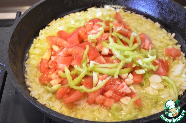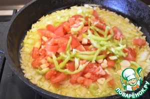 Давлее добавляем помидоры, чеснок и сладкий перец, обжариваем несколько минут на сильном огне.