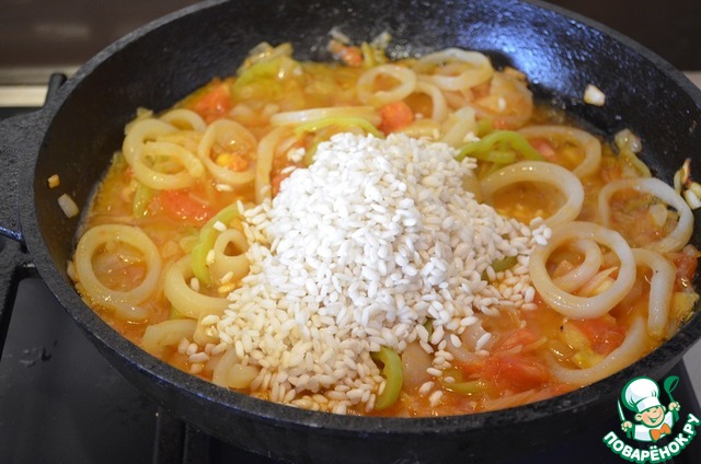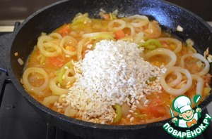 Рис обжариваем-2-3 минуты, чтоб он в себя впитал все ароматы.