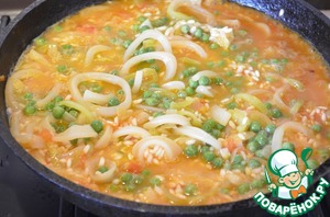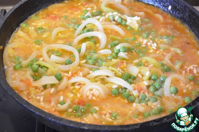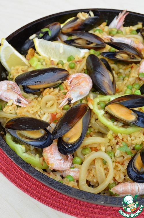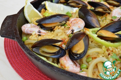 Далее выливаем бульон с шафраном. Выкладываем горошек. У меня бульон оказался хорошо соленым, соли я больше не добавляла. уменьшаем огонь до минимума, и готовим под закрытой крышкой, около 15-20 минут. За 2-3 минуты до окончани готовки, выкладываем креветки и мидии. Выключаем огонь и держим паэлью несколько минут. Обязательно поливаем паэлью соком лимона. Сразу подаем к столу и кушаем горячую. Очень хорошо под белое вино.