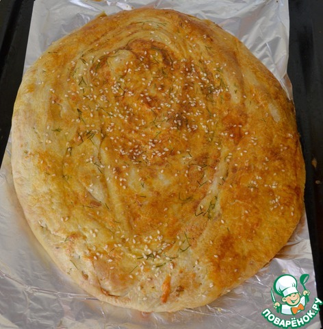 Руками (или с помощью скалки - кому как удобнее) разминаем нашу улитку до состояния лепешки, помещаем её на смазанный маслом пергамент на противне (я использую силиконовый коврик, поэтому обхожусь без масла), смазываем яйцом, накалываем вилкой, присыпаем кунжутом и чернушкой. У меня лепешка получилась на весь противень, в диаметре около 35 см. Ставим в разогретую духовку и с нетерпением ждем минут 20-30.