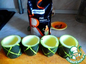 Берем цуккини длиной 25 см и режем его на 4 части. Вычищаем каждый кусочек от мякоти, оставляя стенки и дно и образуя стаканчик. Я ножом еще сделала на кожице цуккини рельефные надрезы.