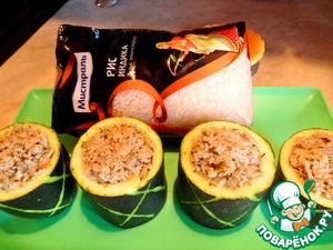 В готовый фарш добавляем часть мелко порезанной зелени, отваренный до полуготовности рис Индика ТМ "Мистраль" и фаршируем наши цуккини.