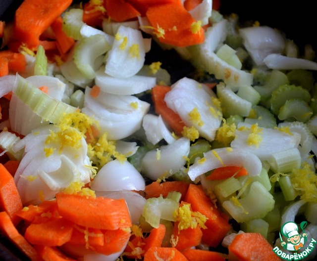 Добавляем цедру и нарезанную ботву, томатный соус.
