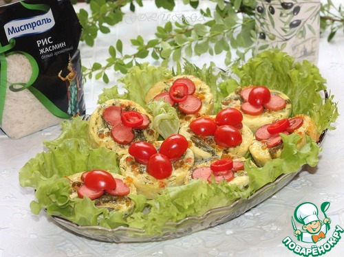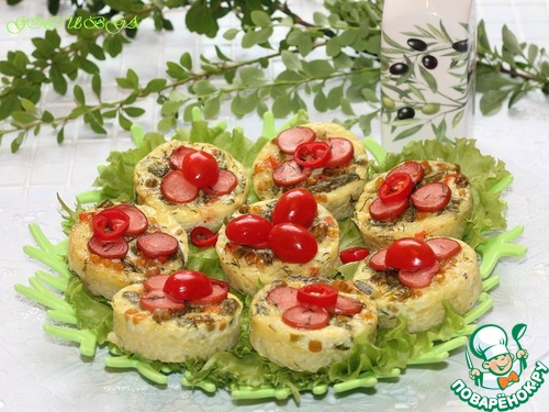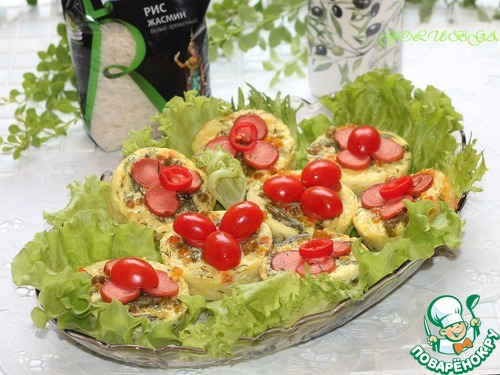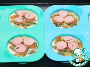 Сверху раскладываем кружочки сосисек и отправляем формочки в духовку на 20-30 мин., выпекаем до золотистой корочки.
