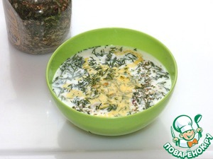 Готовим омлетную заливку: взбить яйца с молоком в блендере и добавить зелень и специи.