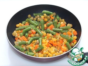 Обжариваем на оливковом масле порезанные овощи; морковь, зеленую фасоль, добавляем к ним кукурузу с горошком и специи.