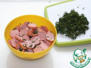 Шинкуем зелень и нарезаем тонкими кружочками сосиски.