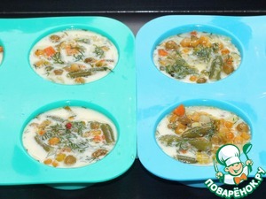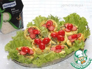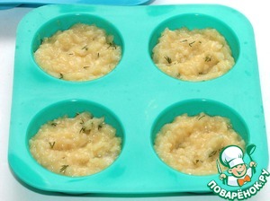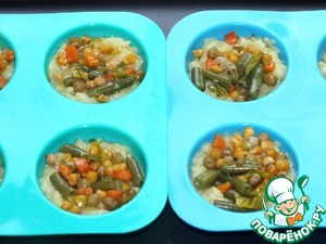 Разогреваем духовку до t 190 С. Достаем формочки для выпечки, у меня силиконовые, их не надо смазывать маслом. В каждую ячейку выкладываем рис.