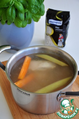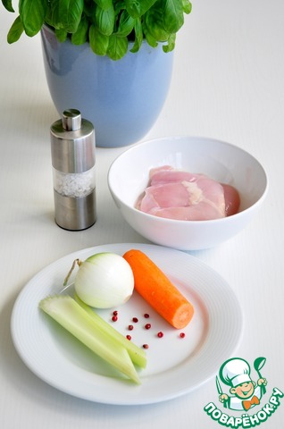 Приготовить куриный бульон. Овощи почистить помыть. Филе зачистить от пленок, Залить двумя литрами воды. Добавить перец горошком, лавровый лист, морковь и репчатый лук разрезать на четыре части, сельдерей на две части. Варить на медленном огне минут 30, время от времени собирая пену с поверхности бульона. В конце приготовления чуть посолить.