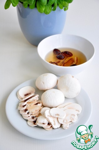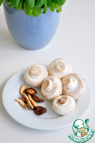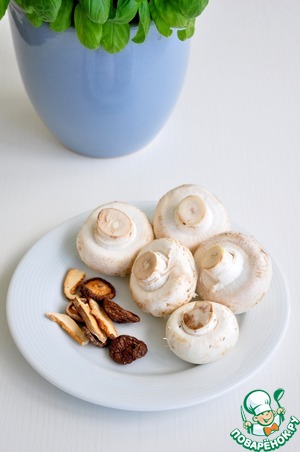 У шампиньонов очистить от кожицы шляпки, ножки почистить ножом. Нарезать тонкими полосками. Сушеные грибы залить кипятком, накрыть и дать настояться минут 20.